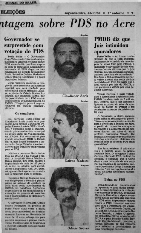 Nas primeiras eleições, em 1982, o governador saiu de carro, avião e helicóptero por Rondônia, elegendo três senadores do PDS: Claudionor Roriz, Odacir Soares Rodrigues e Reinaldo Galvão Modesto, cinco dos oito deputados federais, e nove dos 24 estaduais.